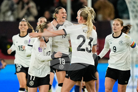 German players celebrate after the UEFA Women's Nations League semifinal first leg soccer match between Germany and France in Duesseldorf, Germany, Friday, Oct. 24, 2025. (AP Photo/Martin Meissner)