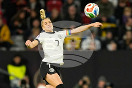 Germany's Giulia Gwinn jumps for the ball during the UEFA Women's Nations League semifinal first leg soccer match between Germany and France in Duesseldorf, Germany, Friday, Oct. 24, 2025. (AP Photo/Martin Meissner)