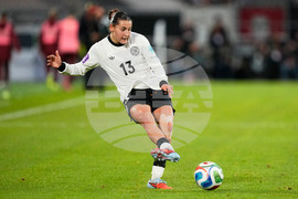 Germany's Sjoeke Nuesken misses during the UEFA Women¥s Nations League semifinal first leg soccer match between Germany and France in Duesseldorf, Germany, Friday, Oct. 24, 2025. (AP Photo/Martin Meissner)