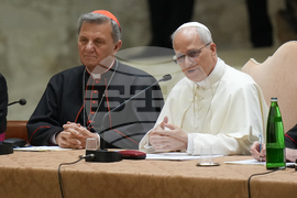 Pope Leo XIV, left, and Bishop Luis Marin de San Martin, listen to sister Nathalie Becquart, right, during an audience with the participants in the Jubilee of the Synodal Teams and Participation Bodies in the Paul VI Hall, at the Vatican, Friday, Oct. 24, 2025. (AP Photo/Alessandra Tarantino)