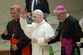 Pope Leo XIV, right, is flanked by Cardinal Mario Grech during an audience with the participants in the Jubilee of the Synodal Teams and Participation Bodies in the Paul VI Hall, at the Vatican, Friday, Oct. 24, 2025. (AP Photo/Alessandra Tarantino)