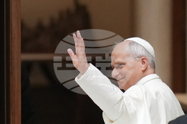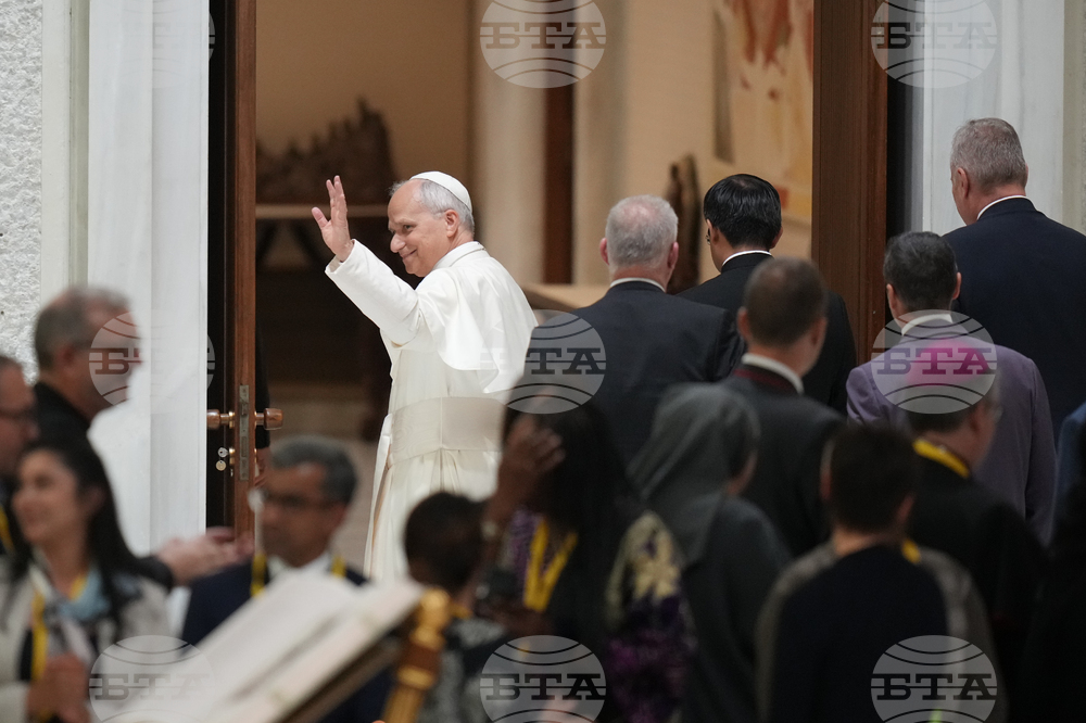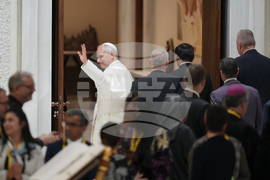 Pope Leo XIV leaves at the end of an audience with the participants in the Jubilee of the Synodal Teams and Participation Bodies in the Paul VI Hall, at the Vatican, Friday, Oct. 24, 2025. (AP Photo/Alessandra Tarantino)