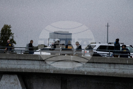 A vehicle exits a security perimeter as investigators with the Federal Bureau of Investigation survey the scene the morning after security personnel opened fire on a U-Haul truck as it backed up a ramp at the entrance to Coast Guard Island Alameda in Oakland, Calif., Friday, Oct. 24, 2025. (Stephen Lam/San Francisco Chronicle via AP)
