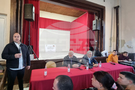 Село Труд (24 октомври 2025) От утре се възстановява движението на маршрутна линия №5 до селата Труд и Строево. Това обещава пред жителите на село Труд в читалището управителят на фирмата превозвач. На срещата присъстват още кметът на община Марица и кметът на село Труд. На снимката: управителят на фирмата превозвач Петко Ангелов и кметът на община Марица Димитър Иванов (вдясно).