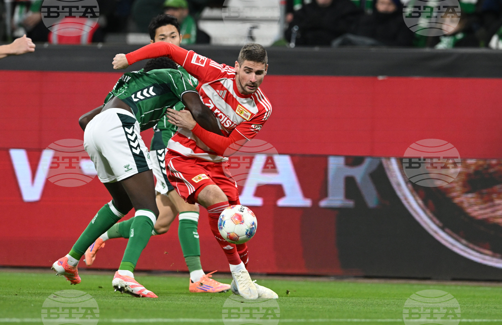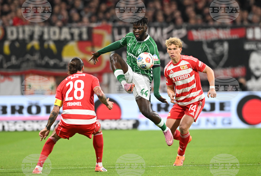 Bremen's Marco Friedl, left, and Berlin's Oliver Burke in action during the Bundesliga soccer match between FC Union Berlin, Matchday 8, at Weserstadion in Bremen, Germany, Friday Oct. 24, 2025. (Carmen Jaspersen/dpa via AP)