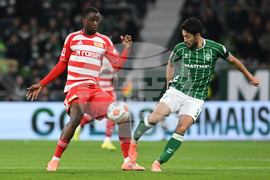 Bremen's Yukinara Sugawara, right, and Berlin's Ilyas Ansah in action during the Bundesliga soccer match between FC Union Berlin, Matchday 8, at Weserstadion in Bremen, Germany, Friday Oct. 24, 2025. (Carmen Jaspersen/dpa via AP)