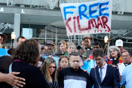 FILE - Foreground from right, Attorney Simon Sandoval-Moshenberg, Kilmar Abrego Garcia and Garcia's wife Jennifer Vasquez Sura attends a protest rally at the Immigration and Customs Enforcement field office in Baltimore, Monday, Aug. 25, 2025. (AP Photo/Stephanie Scarbrough, File)
