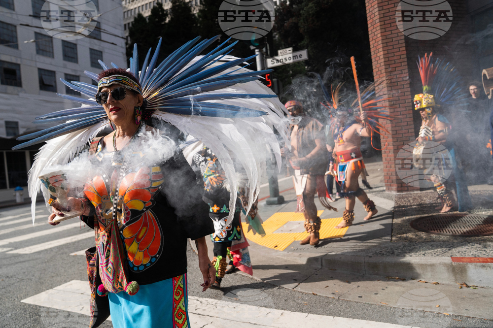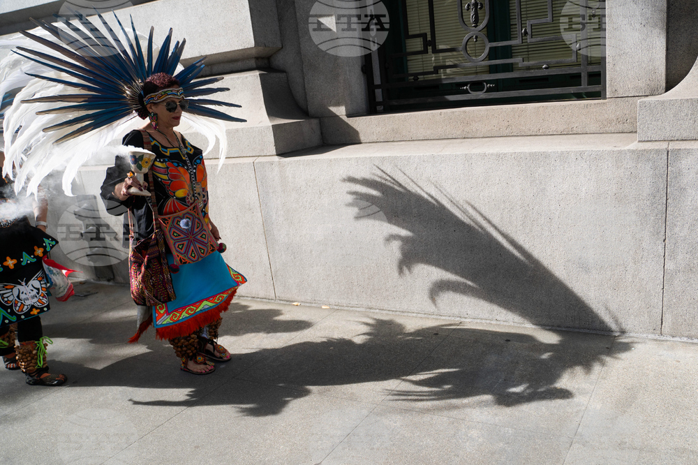 Traditional Aztec dancers rally outside US immigration and customs enforcement field office, Friday, Oct. 24, 2025, in San Francisco. (AP Photo/Minh Connors)