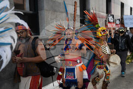 Traditional Aztec dancers and protestors rally outside US immigration and customs enforcement field office, Friday, Oct. 24, 2025, in San Francisco. (AP Photo/Minh Connors)