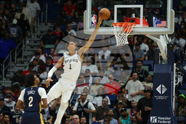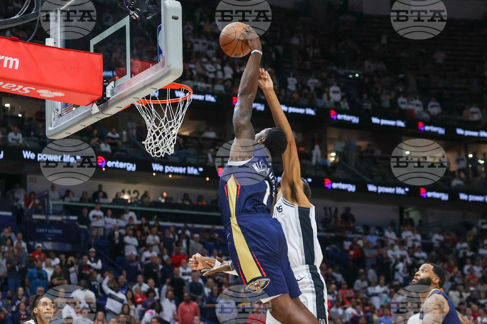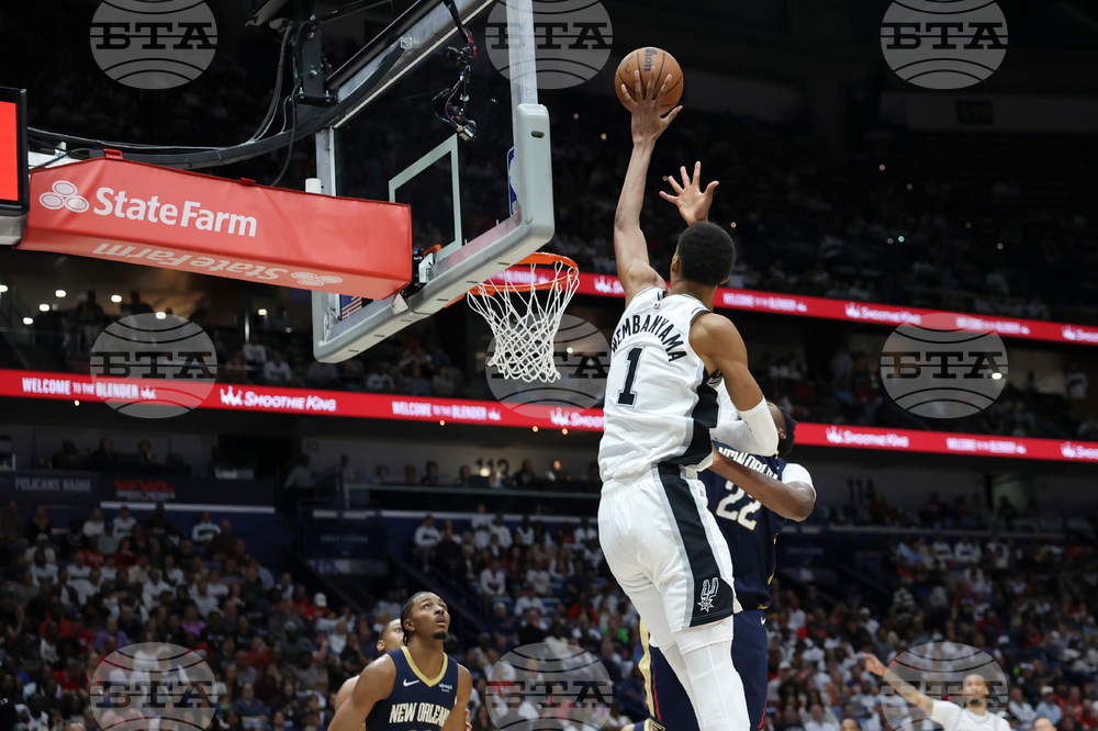 San Antonio Spurs forward Victor Wembanyama (1) dunks on New Orleans Pelicans center Derik Queen (22) during the second half of an NBA basketball game Friday, Oct. 24, 2025, in New Orleans. (AP Photo/Peter Forest)