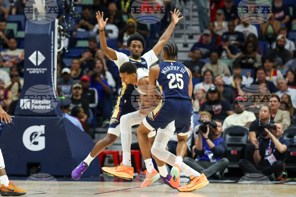 New Orleans Pelicans forward Trey Murphy III (25) tries to strip the ball from San Antonio Spurs forward Victor Wembanyama (1) during the first half of an NBA basketball game Friday, Oct. 24, 2025, in New Orleans. (AP Photo/Peter Forest)