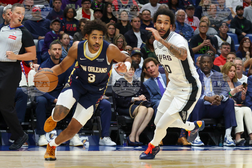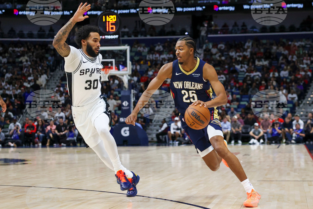 New Orleans Pelicans forward Trey Murphy III (25) tries to drive past San Antonio Spurs forward Julian Champagnie (30) during the first half of an NBA basketball game Friday, Oct. 24, 2025, in New Orleans. (AP Photo/Peter Forest)