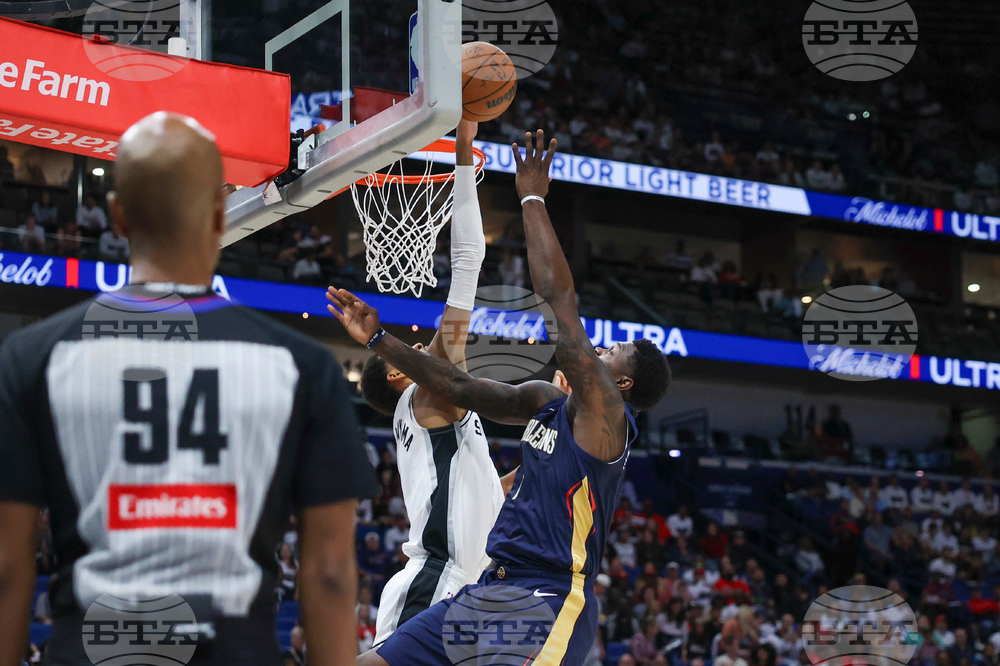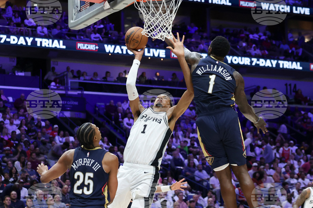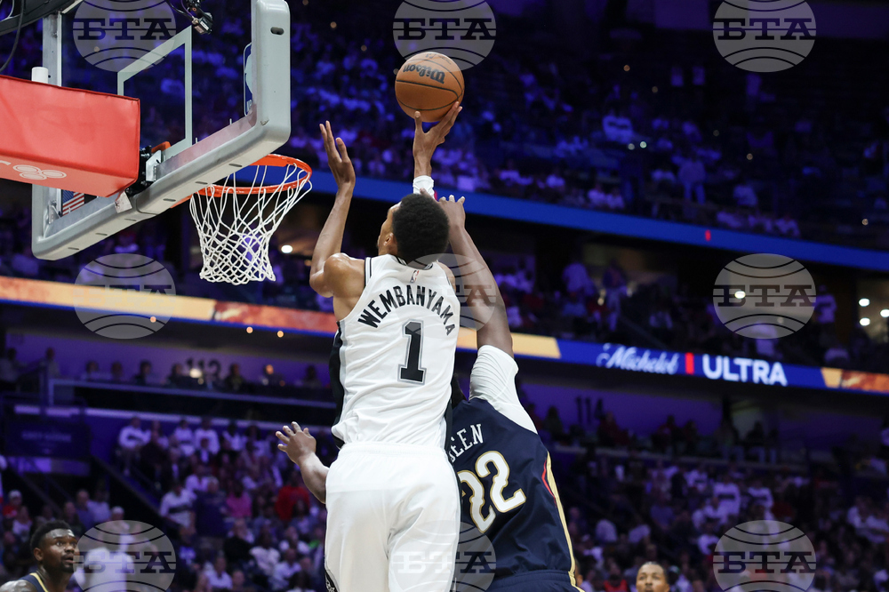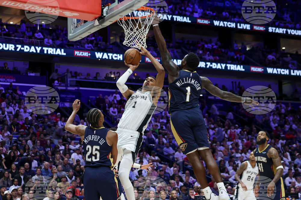 San Antonio Spurs forward Victor Wembanyama (1) tries to block a shot by New Orleans Pelicans forward Zion Williamson (1) during the first half of an NBA basketball game Friday, Oct. 24, 2025, in New Orleans. (AP Photo/Peter Forest)