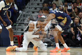 San Antonio Spurs guard Dylan Harper (2) attempts a New Orleans Pelicans guard Jeremiah Fears (0) during the first half of an NBA basketball game Friday, Oct. 24, 2025, in New Orleans. (AP Photo/Peter Forest)
