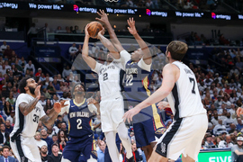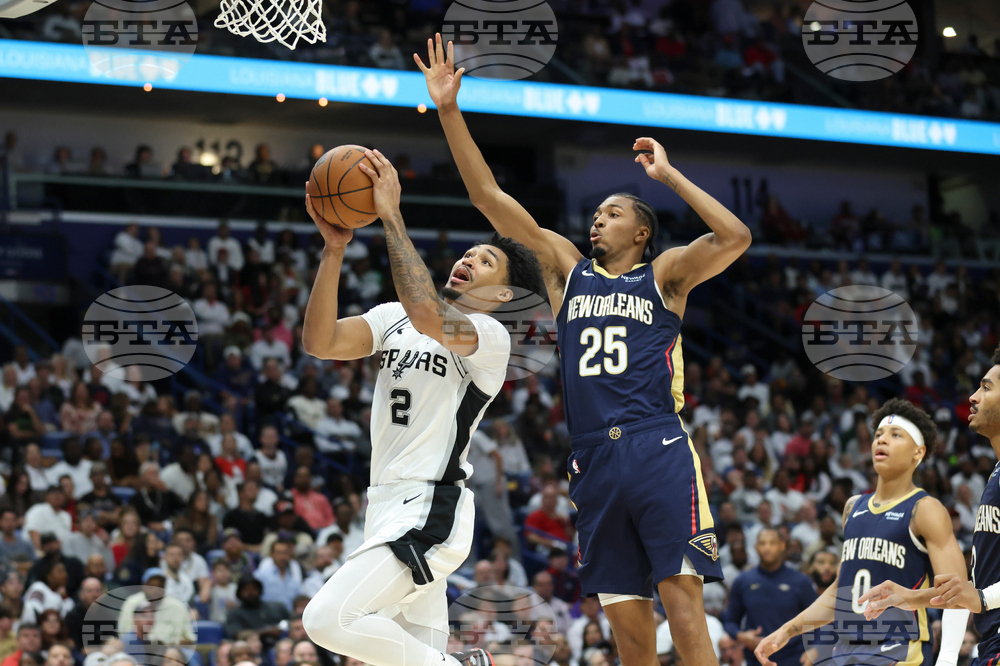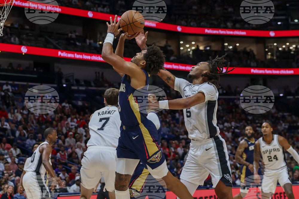 New Orleans Pelicans forward Herbert Jones (2) tries to block San Antonio Spurs guard Devin Vassell (24) during the first half of an NBA basketball game Friday, Oct. 24, 2025, in New Orleans. (AP Photo/Peter Forest)