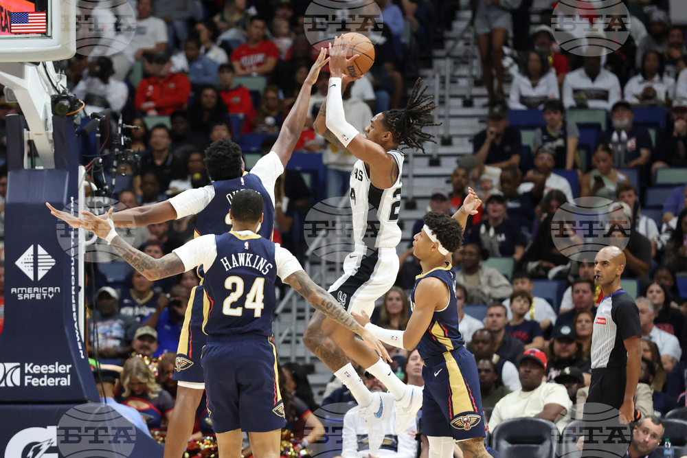 San Antonio Spurs guard Devin Vassell (24) shoots a jumper over New Orleans Pelicans center Derik Queen (22) during the first half of an NBA basketball game Friday, Oct. 24, 2025, in New Orleans. (AP Photo/Peter Forest)