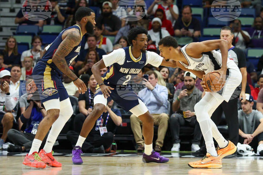 San Antonio Spurs forward Victor Wembanyama (1) tries to make a move against New Orleans Pelicans forward Herbert Jones (2) and guard Saddiq Bey (41) during the first half of an NBA basketball game Friday, Oct. 24, 2025, in New Orleans. (AP Photo/Peter Forest)