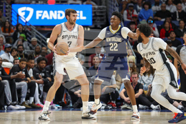 San Antonio Spurs center Luke Kornet (7) tries to make a move against New Orleans Pelicans center Derik Queen (22) during the first half of an NBA basketball game Friday, Oct. 24, 2025, in New Orleans. (AP Photo/Peter Forest)