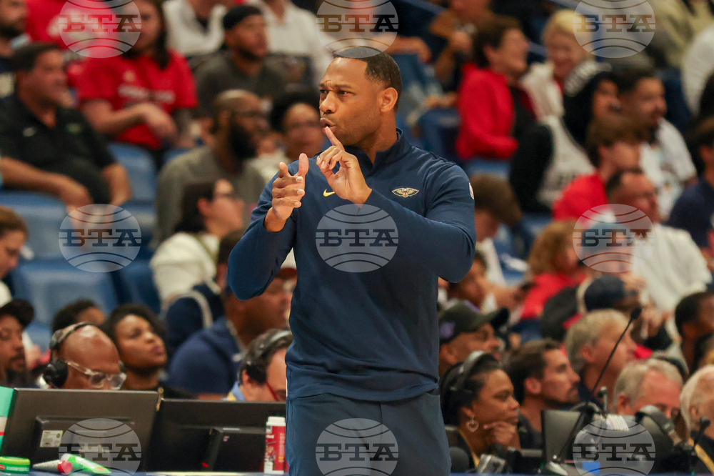 New Orleans Pelicans head coach Willie Green talks to his bench during the first half of an NBA basketball game Friday, Oct. 24, 2025, in New Orleans. (AP Photo/Peter Forest)