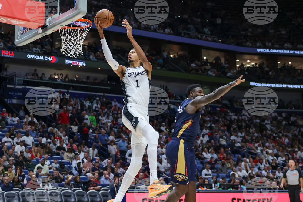 San Antonio Spurs forward Victor Wembanyama, center left, shoots a layup against New Orleans Pelicans forward Zion Williamson, center right, during the second half of an NBA basketball game Friday, Oct. 24, 2025, in New Orleans. (AP Photo/Peter Forest)