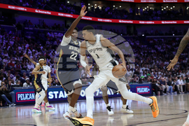 San Antonio Spurs forward Victor Wembanyama (1) tries to drive past New Orleans Pelicans forward Trey Murphy III (25) during the second half of an NBA basketball game Friday, Oct. 24, 2025, in New Orleans. (AP Photo/Peter Forest)