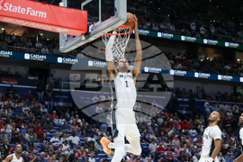 San Antonio Spurs forward Victor Wembanyama (1) throws down a dunk during overtime in an NBA basketball game against the New Orleans Pelicans, Friday, Oct. 24, 2025, in New Orleans. (AP Photo/Peter Forest)