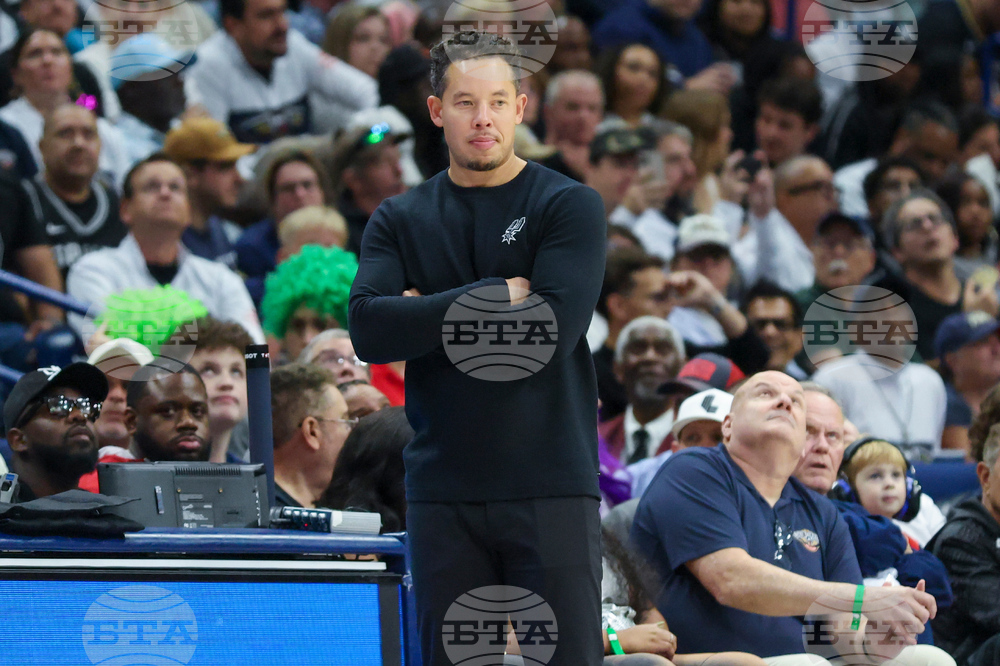 San Antonio Spurs head coach Mitch Johnson watches the action on the court during the second half of an NBA basketball game Friday, Oct. 24, 2025, in New Orleans. (AP Photo/Peter Forest)