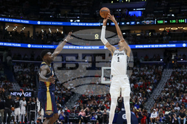 New Orleans Pelicans guard Jordan Poole (3) shoots a breakaway layup during the first half of an NBA basketball game Friday, Oct. 24, 2025, in New Orleans. (AP Photo/Peter Forest)