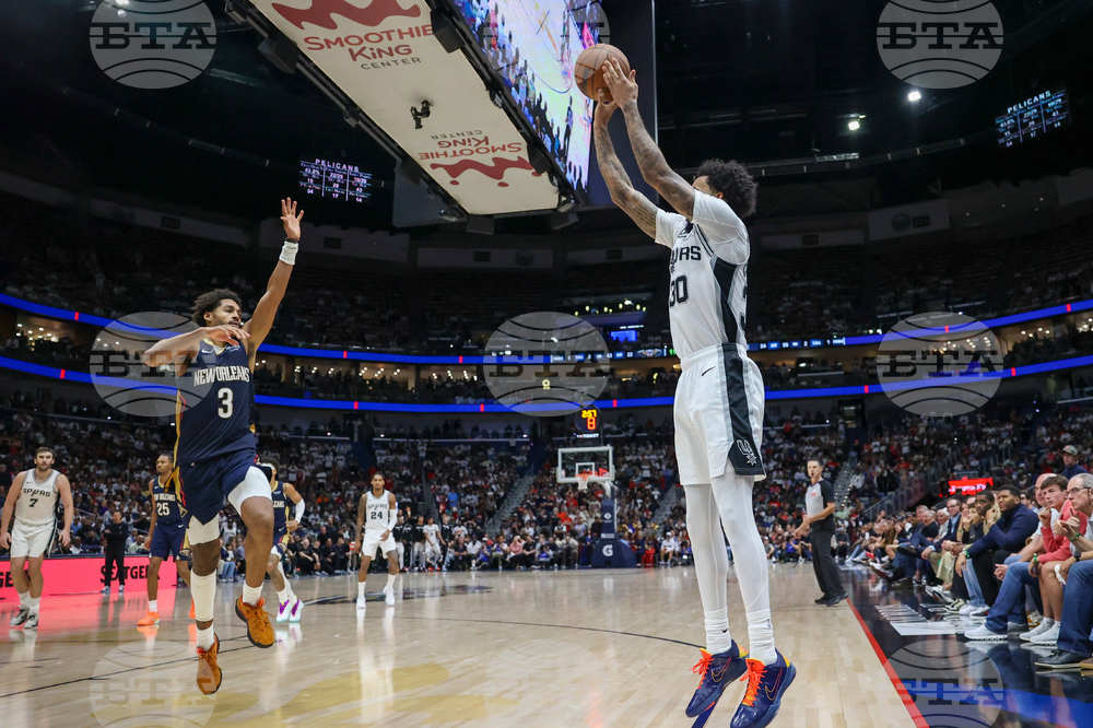 San Antonio Spurs forward Julian Champagnie (30) shoots a three-pointer over New Orleans Pelicans center Derik Queen (22) during the first half of an NBA basketball game Friday, Oct. 24, 2025, in New Orleans. (AP Photo/Peter Forest)