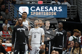 The San Antonio Spurs huddle with a Fanduel sign in the background during the first half of an NBA basketball game Friday, Oct. 24, 2025, in New Orleans. (AP Photo/Peter Forest)