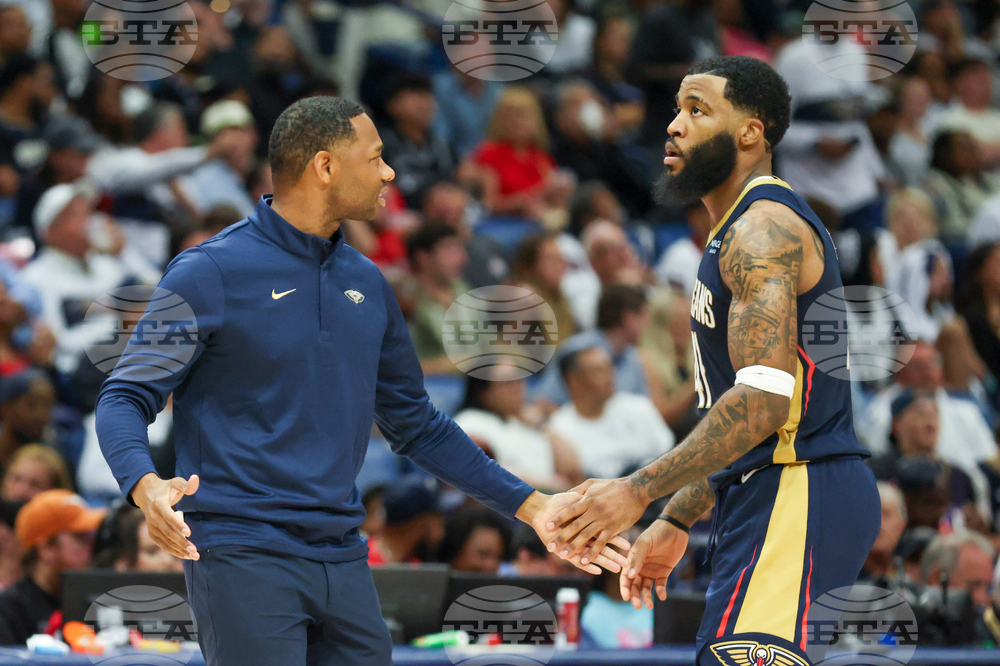 New Orleans Pelicans head coach Willie Green, left, greets guard Saddiq Bey as he walks off the court during the second half of an NBA basketball game against the San Antonio Spurs, Friday, Oct. 24, 2025, in New Orleans. (AP Photo/Peter Forest)