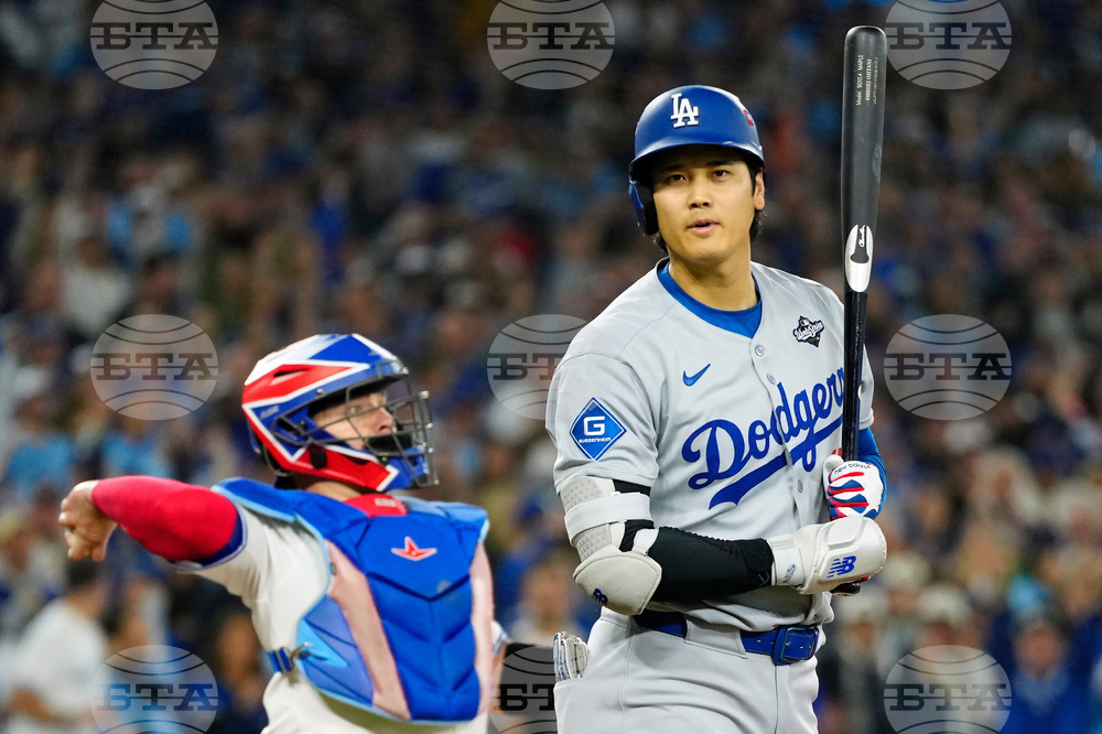 Los Angeles Dodgers' Shohei Ohtani, right, reacts after striking out against the Toronto Blue Jays during the fifth inning of Game 1 of baseball's World Series in Toronto, Friday, Oct. 24, 2025. (Frank Gunn/The Canadian Press via AP)