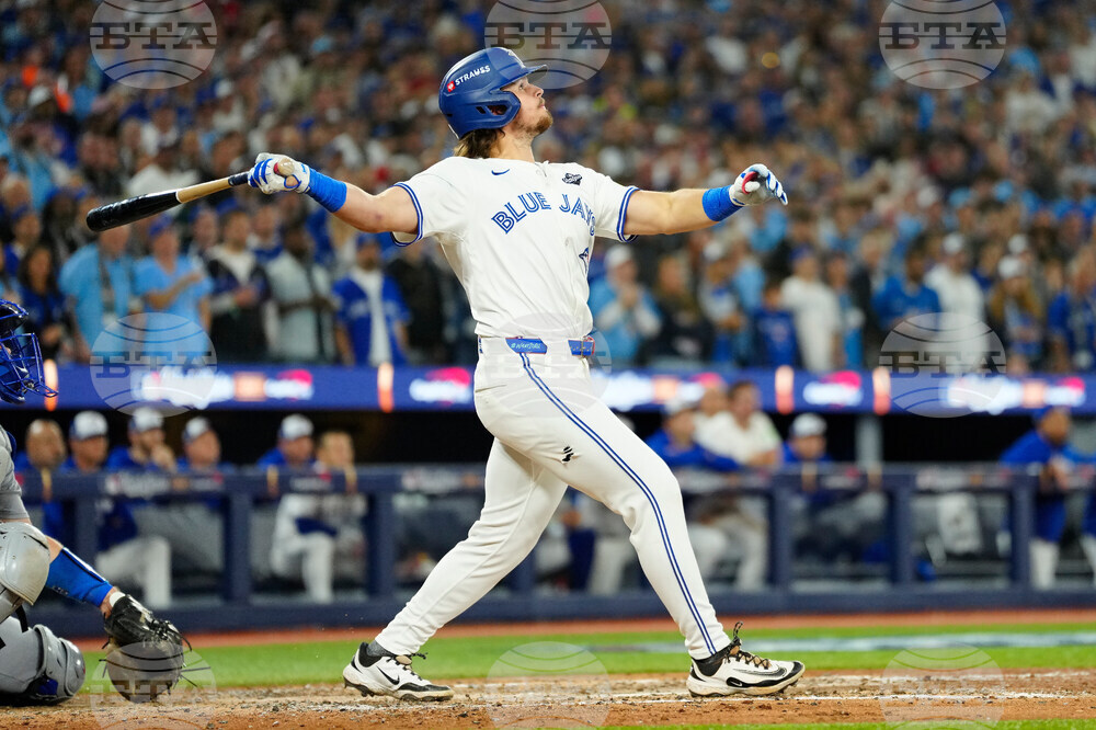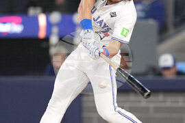 Toronto Blue Jays' Addison Barger watches his grand slam against the Los Angeles Dodgers during the sixth inning of Game 1 of baseball's World Series in Toronto, Friday, Oct. 24, 2025. (Frank Gunn/The Canadian Press via AP)