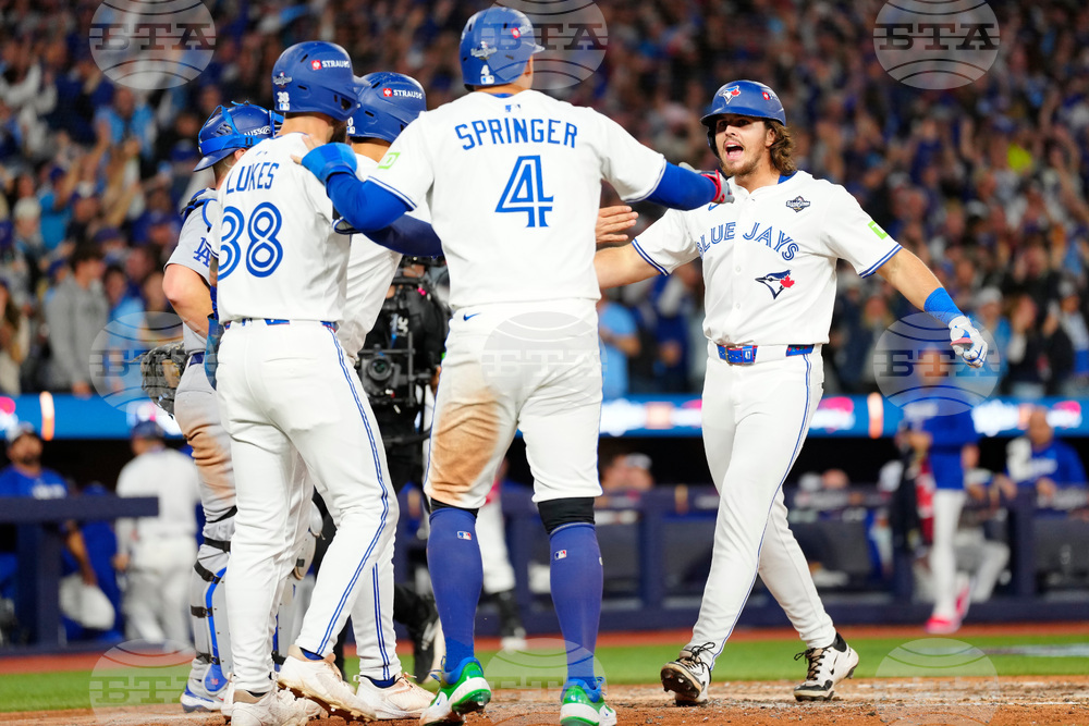 Toronto Blue Jays' Addison Barger, right, celebrates with George Springer (4), Nathan Lukes, front left, and Andrés Giménez (obscured) after hitting a grand slam against the Los Angeles Dodgers during the sixth inning of Game 1 of baseball's World Series in Toronto, Friday, Oct. 24, 2025. (Frank Gunn/The Canadian Press via AP)