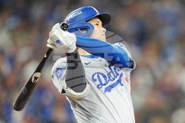 Los Angeles Dodgers' Shohei Ohtani hits a two-run home run against the Toronto Blue Jays during the seventh inning of Game 1 of baseball's World Series in Toronto, Friday, Oct. 24, 2025. (Frank Gunn/The Canadian Press via AP)
