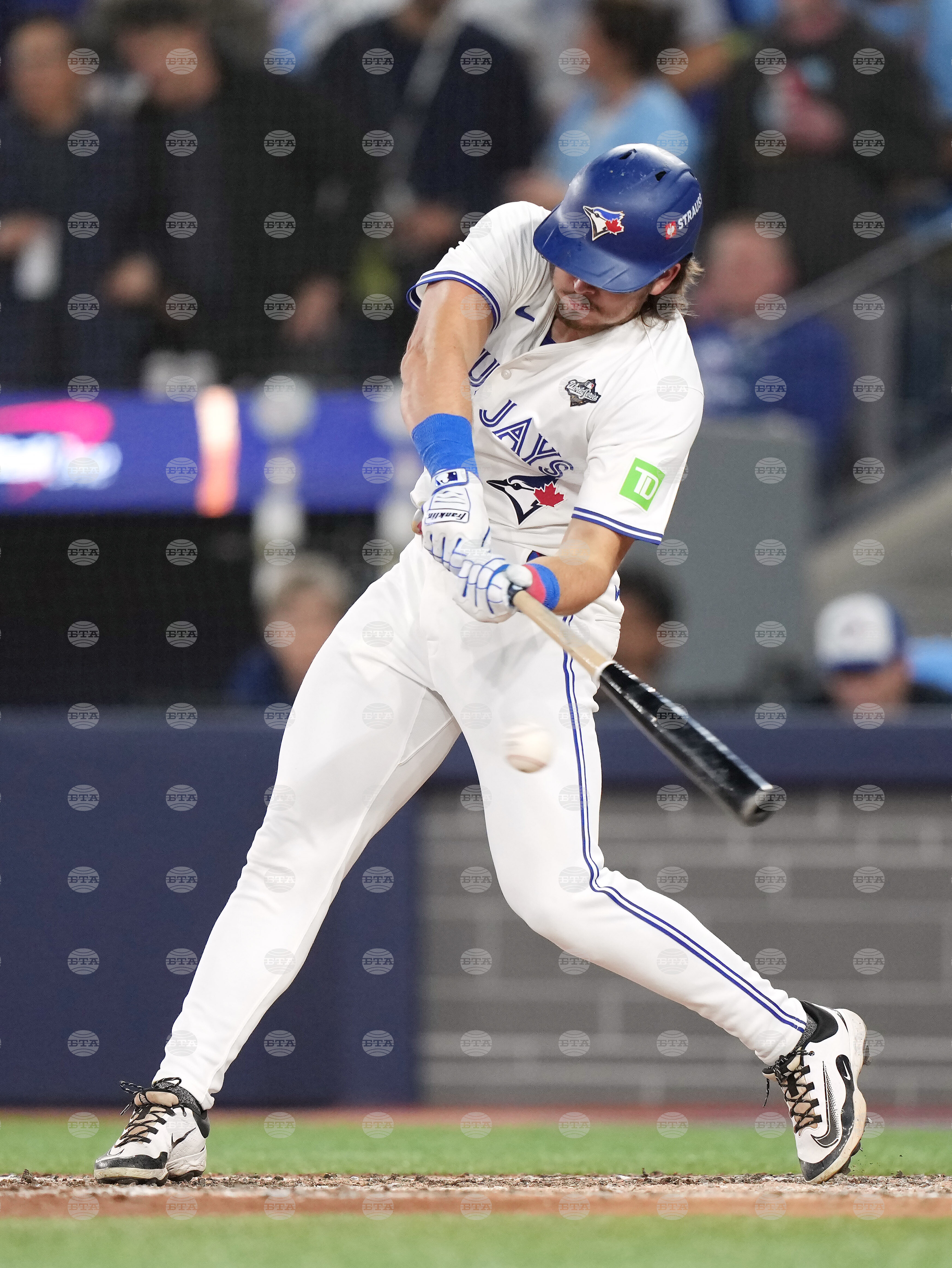 Toronto Blue Jays' Ernie Clement hits a run-scoring single during the sixth inning of Game 1 of baseball's World Series against the Los Angeles Dodgers in Toronto, Friday, Oct. 24, 2025. (Frank Gunn/The Canadian Press via AP)