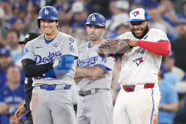 Los Angeles Dodgers' Shohei Ohtani, left, and Toronto Blue Jays first baseman Vladimir Guerrero Jr., right, smile as they look on during a review of a pickoff-attempt during the ninth inning of Game 1 of baseball's World Series in Toronto, Friday, Oct. 24, 2025. (Nathan Denette/The Canadian Press via AP)