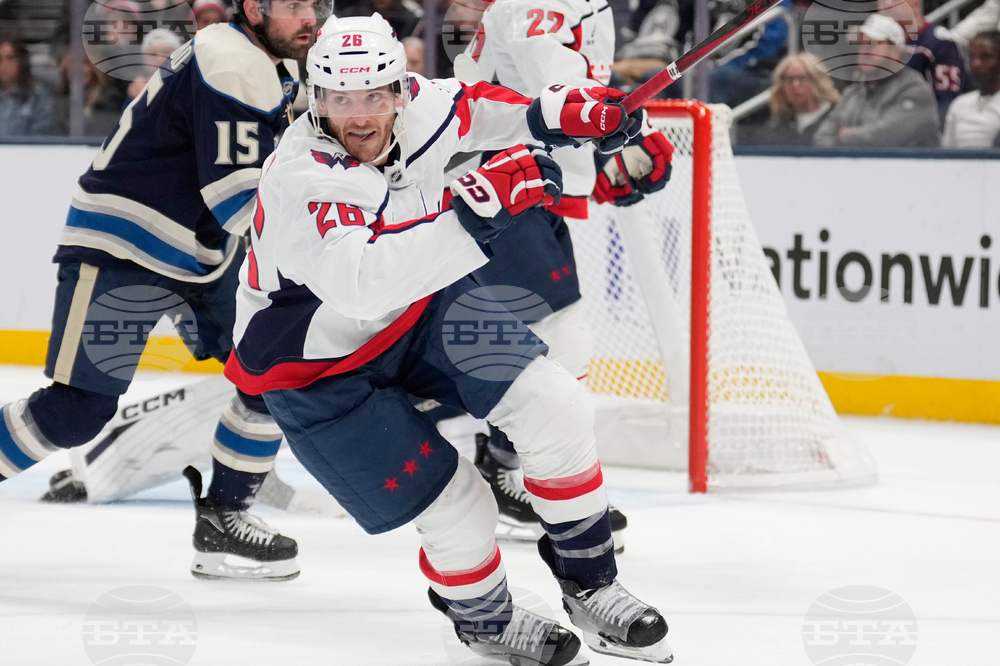 Washington Capitals right wing Tom Wilson celebrates a goal by teammate John Carlson in front of Columbus Blue Jackets defenseman Zach Werenski, right, in the second period of an NHL hockey game Friday, Oct. 24, 2025, in Columbus, Ohio. (AP Photo/Sue Ogrocki)