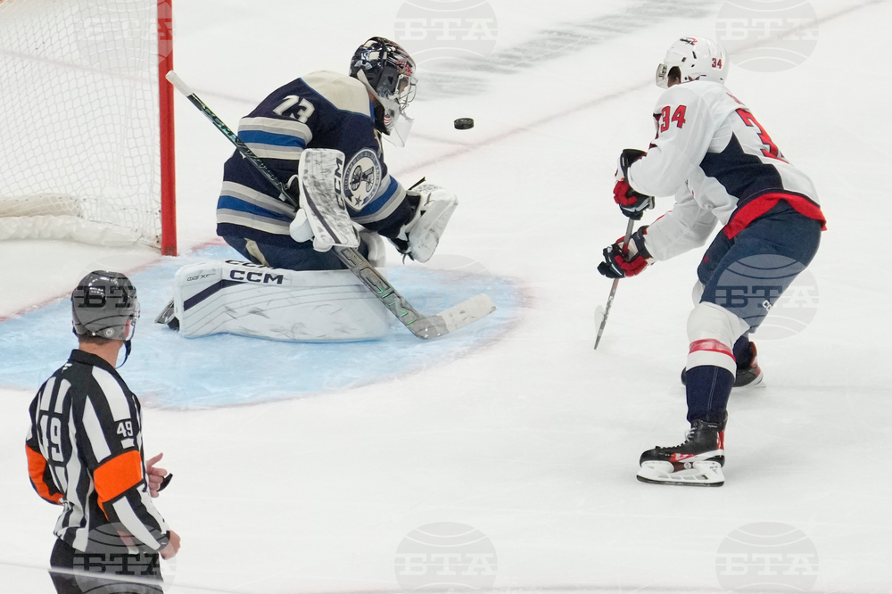 Washington Capitals right wing Justin Sourdif (34) shoots and scores on Columbus Blue Jackets goaltender Jet Greaves in the third period of an NHL hockey game Friday, Oct. 24, 2025, in Columbus, Ohio. (AP Photo/Sue Ogrocki)