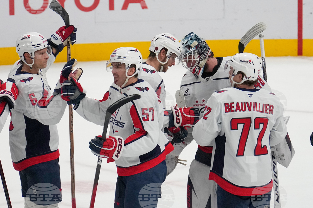 The Washington Capitals celebrate after defeating the Columbus Blue Jackets in an NHL hockey game Friday, Oct. 24, 2025, in Columbus, Ohio. (AP Photo/Sue Ogrocki)