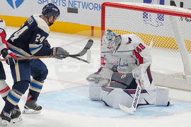 Columbus Blue Jackets goaltender Jet Greaves (73) blocks a shot by Washington Capitals center Hendrix Lapierre in the third period of an NHL hockey game Friday, Oct. 24, 2025, in Columbus, Ohio. (AP Photo/Sue Ogrocki)