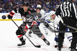 Buffalo Sabres right wing Jack Quinn (22) is pressured by Toronto Maple Leafs center Bobby McMann (74) during the first period of an NHL hockey game Friday, Oct. 24, 2025, in Buffalo, N.Y. (AP Photo/Jeffrey T. Barnes)