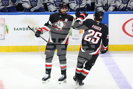 Buffalo Sabres center Tage Thompson, front, celebrates after his goal during the second period of an NHL hockey game against the Toronto Maple Leafs, Friday, Oct. 24, 2025, in Buffalo, N.Y. (AP Photo/Jeffrey T. Barnes)