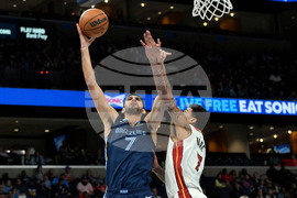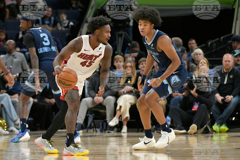Miami Heat forward Nikola Jovic (5) works against Memphis Grizzlies guard Javon Small (10) and forward Jaren Jackson Jr. in the second half of an NBA basketball game Friday, Oct. 24, 2025, in Memphis, Tenn. (AP Photo/Brandon Dill)