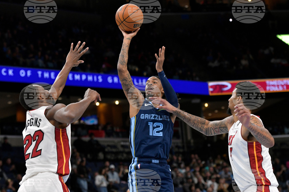 Memphis Grizzlies guard Ja Morant (12) shoots between Miami Heat forward Andrew Wiggins (22) and center Kel'el Ware (7) in the first half of an NBA basketball game Friday, Oct. 24, 2025, in Memphis, Tenn. (AP Photo/Brandon Dill)