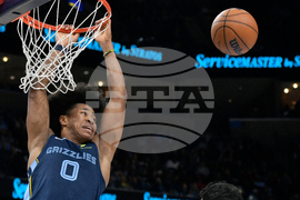 Memphis Grizzlies forward Jaylen Wells (0) misses a dunk in the first half of an NBA basketball game against the Miami Heat Friday, Oct. 24, 2025, in Memphis, Tenn. (AP Photo/Brandon Dill)