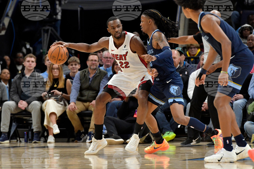 Miami Heat forward Andrew Wiggins (22) handles the ball against Memphis Grizzlies guard Ja Morant in the first half of an NBA basketball game Friday, Oct. 24, 2025, in Memphis, Tenn. (AP Photo/Brandon Dill)