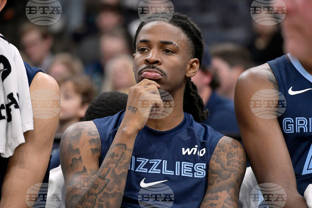 Memphis Grizzlies guard Ja Morant looks on from the bench in the first half of an NBA basketball game against the Miami Heat Friday, Oct. 24, 2025, in Memphis, Tenn. (AP Photo/Brandon Dill)