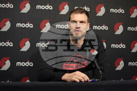 Portland Trail Blazers acting head coach Tiago Splitter arrives at a press conference before an NBA basketball game between the Portland Trail Blazers and the Golden State Warriors, Friday, Oct. 24, 2025, in Portland, Ore. (AP Photo/Amanda Loman)