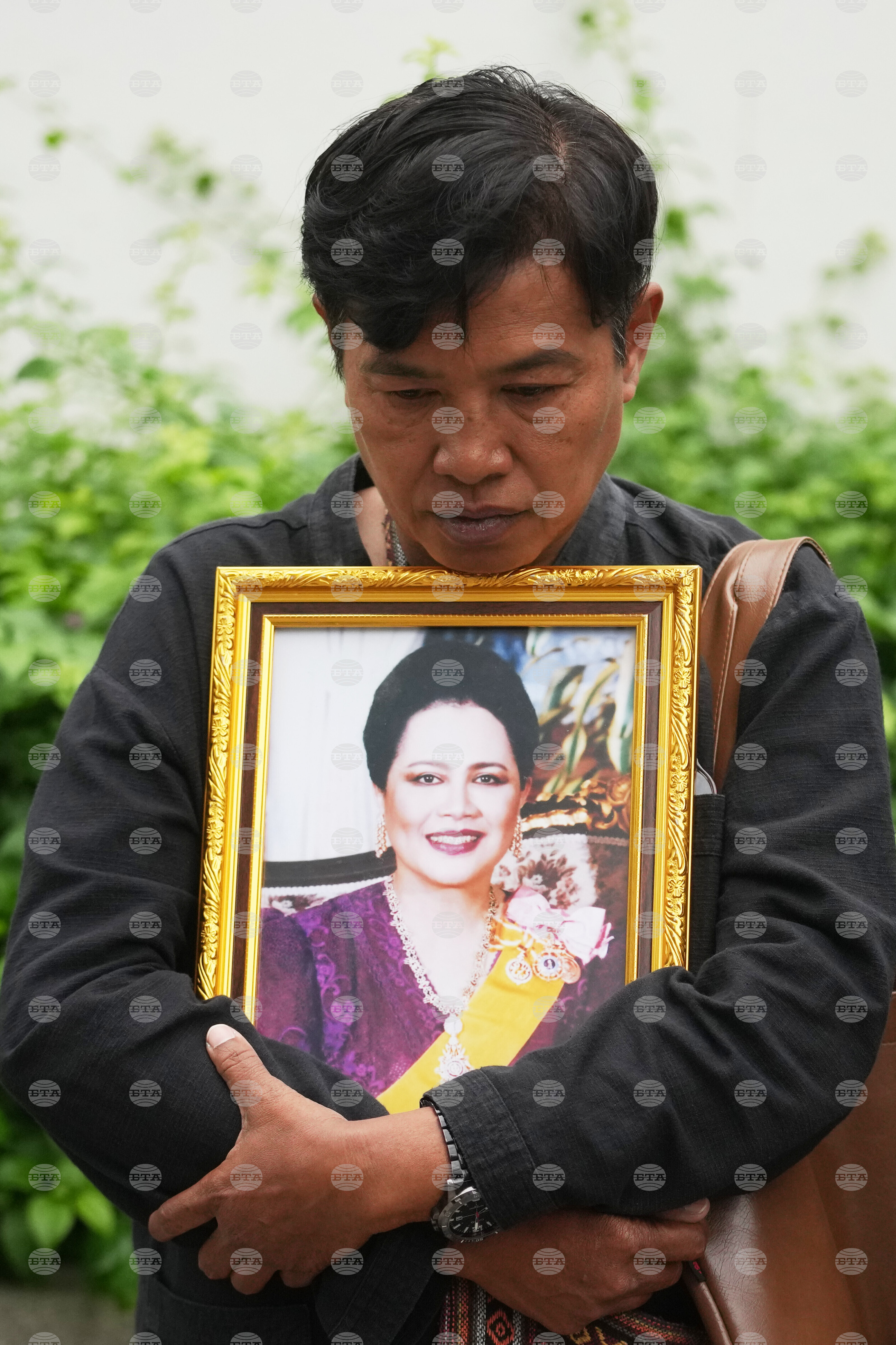 A mourner holds a portrait of Thailand Queen Mother Sirikit in Bangkok, Thailand, Saturday, Oct. 25, 2025. (AP Photo/Sakchai Lalit)